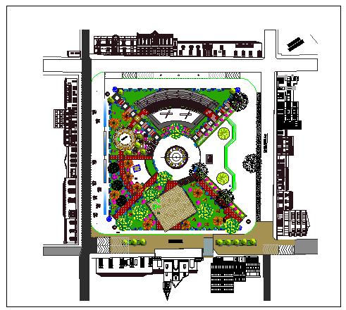 Art gallery landscaping details with all sided elevation that includes a detailed view of front elevation, back elevation, left and right side elevation, doors and windows view, main pedestrian gate, side walk, tree view, green area, landscaping view, decorative garden equipment, fountain, pergola,