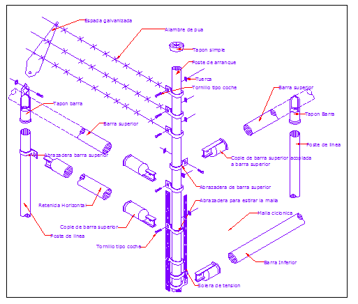 Installation of cyclonic net of perimeter fence of garden that includes a detailed view of iron fence details, joints of fence, measures, Simple Installation Detail, Detail of Reinforced Installation, Simple plug, Starting post, Nut, Car type screw, Top bar, Top bar coupling coupled, to top bar, Upper bar clamp and much more of fence installation details.