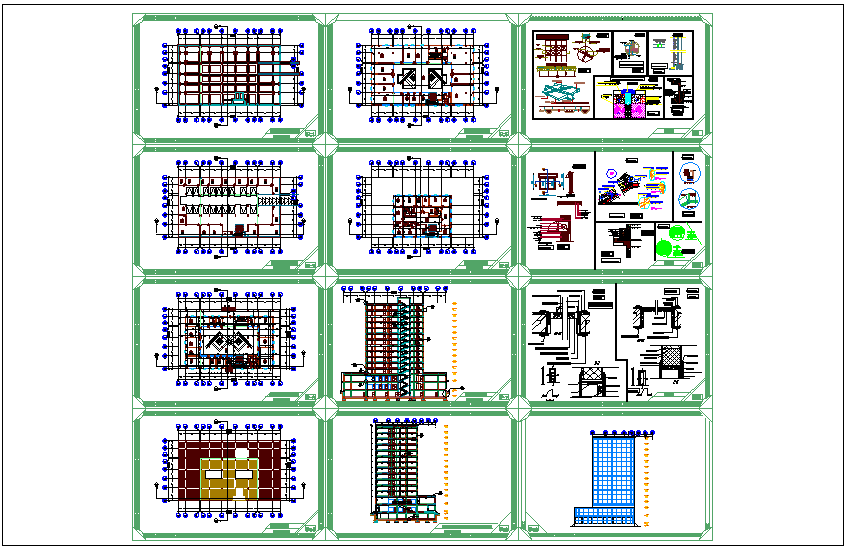 Floor plan,elevation,section view,door,window and structural detail of office building dwg file in floor plan with view of foundation plan,ground floor plan and other floor plan