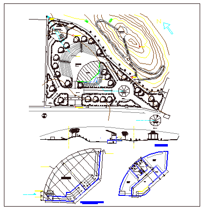 Center theme garden architecture project that includes a detailed view of main gate elevation, back elevation, tree view, perimeter fence, parking view, pedestrian side walk, green area, fountain, wooden banks, decorative garden equipment, children play ground equipment, pergola, gazebo, view point and much more of garden landscaping details.