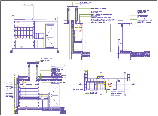 Fire place grill details of barbecue kitchen that includes a detailed view of kitchen elevation, kitchen sectional view, cuts details, measures, door and ventilation, indoor kitchen interior, chimney view, platform view and much more of barbecue kitchen details.
