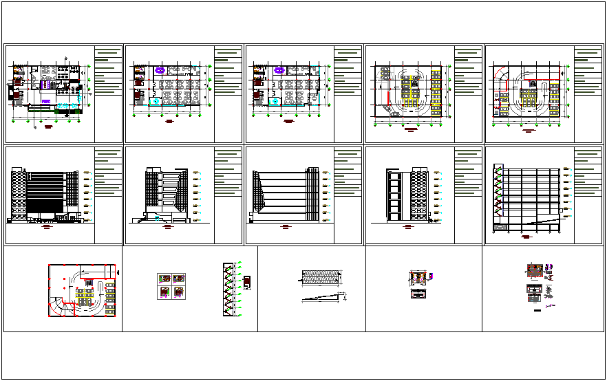 Office building floor plan,elevation and section view with stair and structural detail view dwg file