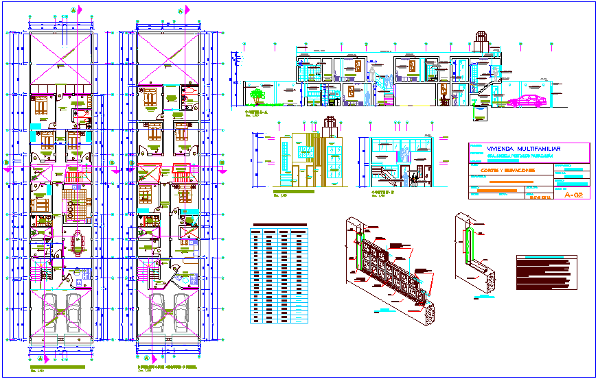 Multi family building distribution plan,door and window detail,cement block view with elevation and section view dwg file