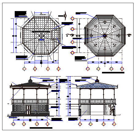 Wooden kiosk details of public garden that includes a detailed view of main elevation view, sectional view, roof view, wooden supportive column view, wooden design, surrounding wooden fence, wooden roof measures and sectional details, main entry door, staircase and much more of kiosk details.