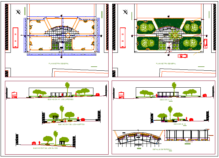 Urban park landscaping architecture project that includes a detailed view of main entry gate elevation, car parking area, green area, banks, pergola, water area, back elevation, gazebo, tree view, light poles, fountain, landscaping, fountain, decorative garden equipment, children playground equipment and much more of landscaping details.