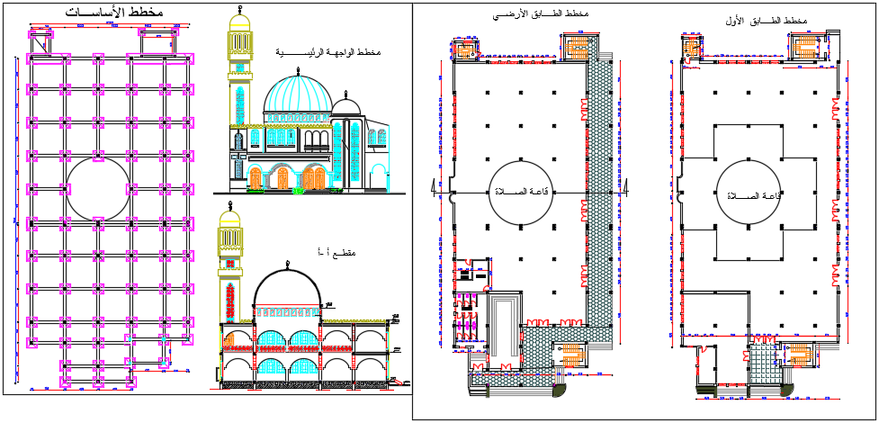 This Mosque CAD file provides a complete architectural and structural layout, including a detailed foundation plan, dome design, minaret elevation, and sectional drawings. The layout showcases both the ground and first-floor plans with prayer hall arrangements, wall dimensions, and entry zones. The architectural elevation illustrates traditional Islamic elements such as arches, domes, and ornamental details. Each section is precisely drafted to ensure design accuracy and visual symmetry, reflecting a blend of modern drafting precision and cultural artistry.