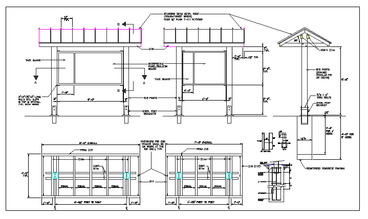 Wooden kiosk details of private garden that includes a detailed view of pergola elevation, pergola sectional details, wooden box details, wooden pillars, wooden roof, measures, cuts, joints, and much more of kiosk details.