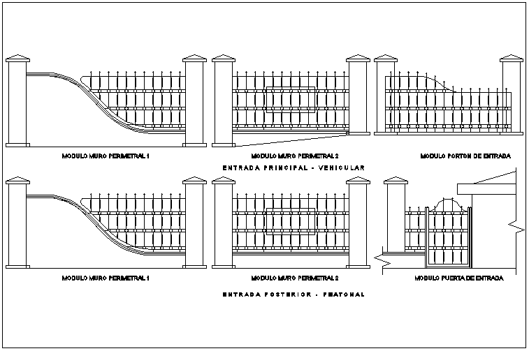 Sections of perimeter fence with wall design that includes a detailed view of that includes a detailed view of metal fence design, gate elevation with design, brick wall design, measures, cuts, joints and much more of fence details of garden.