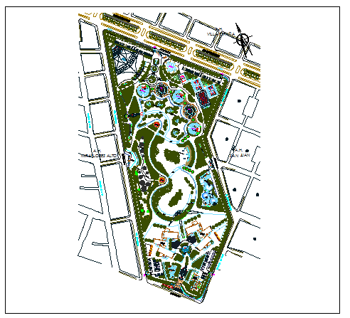 Recreation children park landscaping details that includes a detailed view of main entry gate, side walk view, landscaping view, green area, tree and plants view, decorative tree equipment, decorative garden equipment, children playground equipment, water area, fountain, gazebo, restaurant, dining area, kiosk, slides, car parking area and much more of park landscaping details.