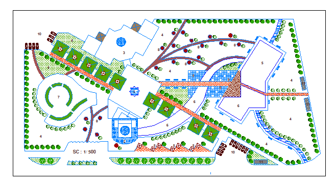 Landscaping details of community park that includes a detailed view of main entry gate, side walk view, landscaping view, green area, tree and plants view, decorative tree equipment, decorative garden equipment, children playground equipment, water area, fountain, gazebo, restaurant, dining area, kiosk, slides, car parking area and much more of park landscaping details.