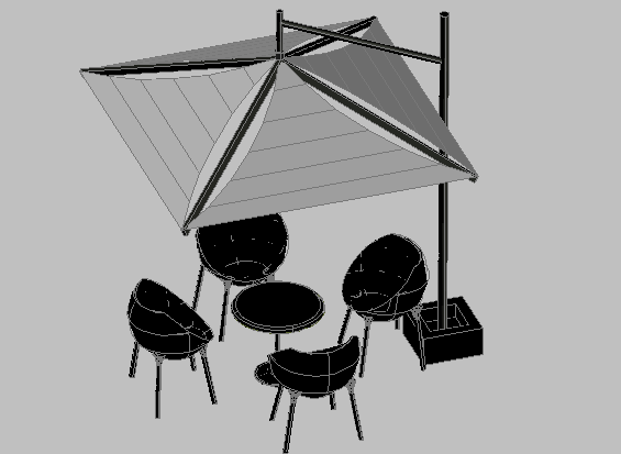 3d design of parasol of outdoor garden that includes a detailed view of aluminium pole for umbrella support, canvas umbrella, chairs view, center table view and much more of garden parasol details.