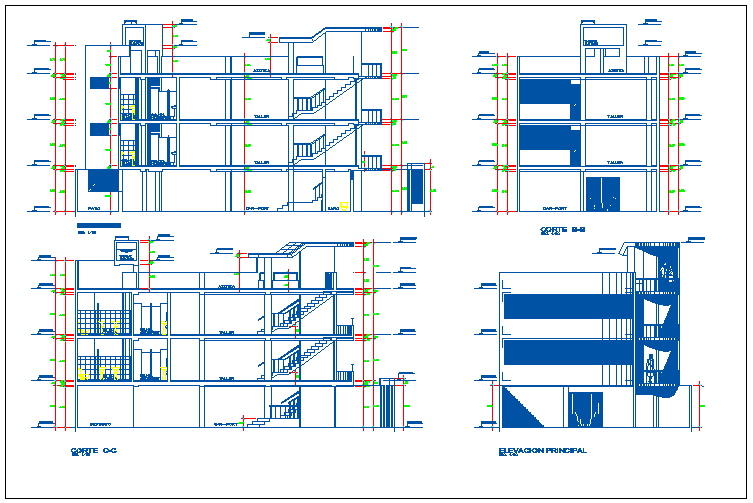 Detailed elevation and sectional view of three flooring clothing showroom front main elevation, back elevation, side elevations, all sided sections, doors and windows view, wall design, staircase view, tree view, roof view, indoor staircase and much more of showroom elevation and section details.