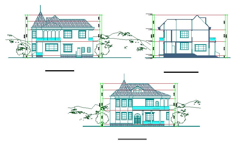 House Elevation Detail & Side view design in cad file & 2 Floor Elevation & Ground Floor & First Floor Detail & All three side elevation detail.