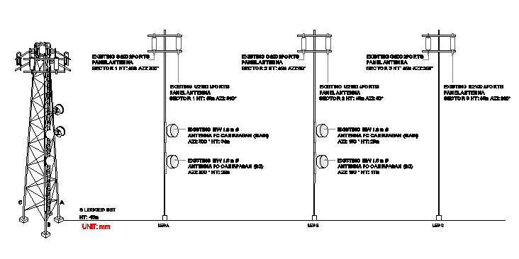 Three legged electric tower architecture project that includes a detailed view of existing port panel antenna, existing two ports panel antenna, cable details, voltage and much more of tower details.