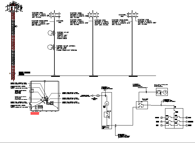 Electric tower installation details with cabin that includes a detailed view of existing port panel antenna, existing two ports panel antenna, cable details, cable, genset, fuel tank, measures voltage and much more of tower details.