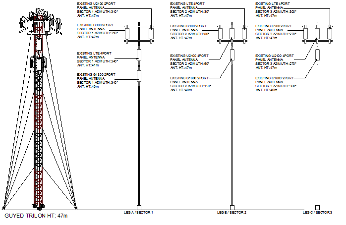 Electric installation of three legged tower that includes a detailed view of existing port panel antenna, existing two ports panel antenna, cable details, cable, genset, fuel tank, measures voltage, power one, vacant, spare, label, exhausted fan, light, incoming power phase, conduct and much more of tower details.