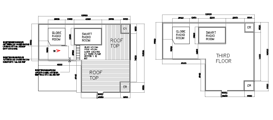 Radio electric tower cabin and floor details that includes a detailed view of third floor, smart radio room, globe radio room, roof top, pole, cabin located at third floor, existing microwave antenna, panel antenna, measures and much more of tower installation details.