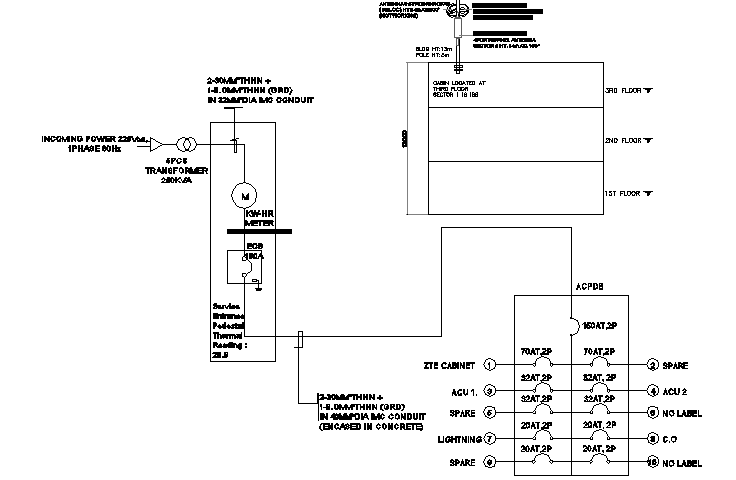 Urban electric tower single line diagram details that includes a detailed view of existing port panel antenna, existing two ports panel antenna, cable details, cable, genset, fuel tank, measures voltage, power one, vacant, spare, label, exhausted fan, light, incoming power phase, conduct and much more of tower details.