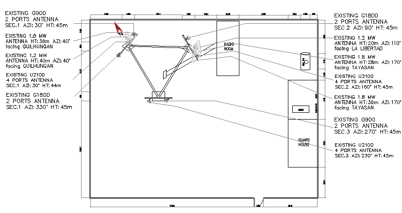 Cabin details with electric installation of tower that includes a detailed view of existing port panel antenna, existing two ports panel antenna, cable details, cable, genset, fuel tank, measures voltage, power one, vacant, spare, label, exhausted fan, light, incoming power phase, conduct and much more of tower details.