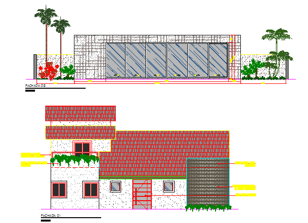 Urban school front and back elevation details that includes a detailed view of front elevation, back elevation, tree view, doors and windows view, wall design and much more of school elevation details.