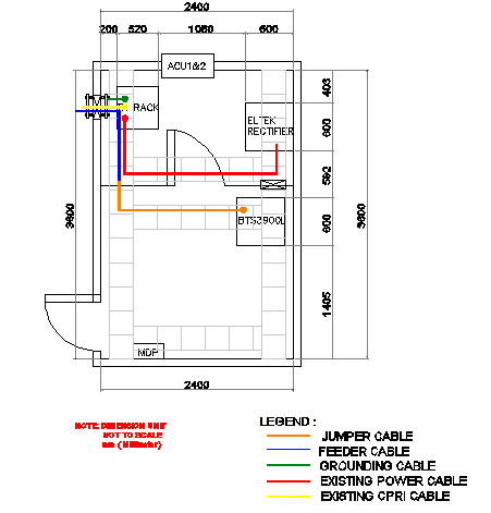 Cable panel details with cabin structure of electric tower that includes a detailed view of jumper cable, feeder cable, grounding cable, existing power cable, existing CPRI cable, feeder window, rack, battery bank and much more of cable panel details.