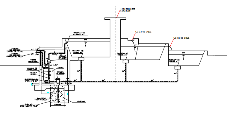 Plumbing line detail dwg file, Plumbing line detail with dimension detail, naming detail, wall detail in mortar detail, valve detail, hidden line detail, center line detail, etc.