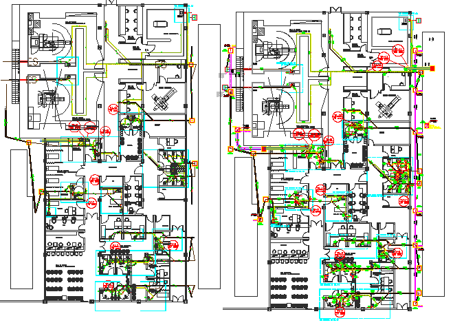 Corporate office layout plan with electric and sanitary installation details dwg file.