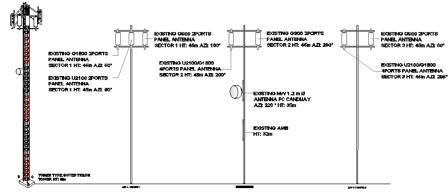 Mabini three legged electric tower installation details that includes a detailed view of existing one and two ports panel antenna, leg one, leg two, leg three, incoming power, transformer, cable panel details, conduct, meter and much more of tower details.