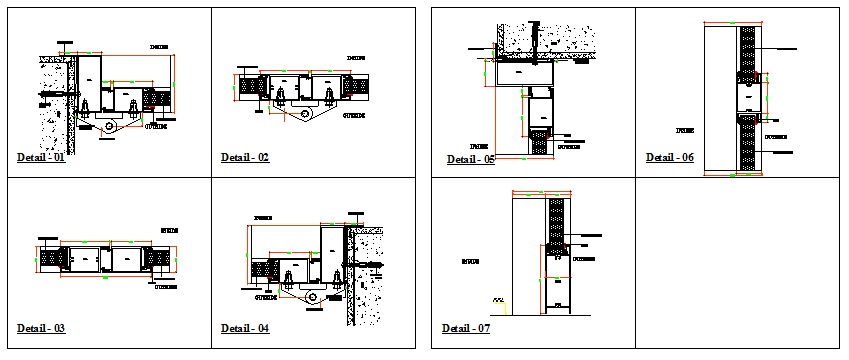 Door installation details of housing that includes a detailed view of door design, door, wooden frame, screw, channel, joint, cuts door handle, door elevation, grill and much more of door details.