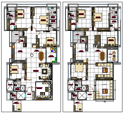 This AutoCAD DWG presentation plan provides a complete residential apartment layout showcasing floor design, furniture arrangement, and circulation flow. The drawing includes two beautifully detailed apartment plans featuring living rooms, bedrooms, modular kitchens, bathrooms, and balconies with accurate scale and proportion. The presentation layout highlights furniture placement and spatial efficiency, ideal for interior designers and architects aiming to visualize functional residential spaces.