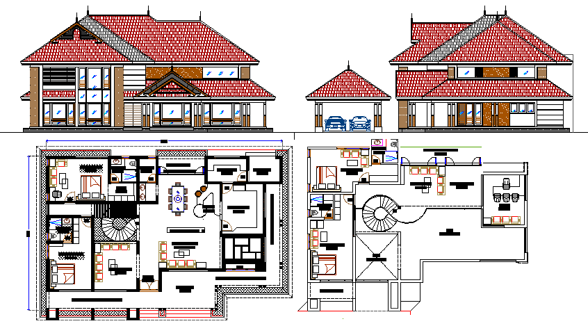 Modern bungalow elevation and layout plan details that includes a detailed view of front elevation, back elevation, balcony view, staircase view, front wall design, roof design, staircase view, car parking view, garden, main entry door, mini garden, family hall, living room, kitchen, dining area, bedroom, master bedroom, toilet and bathroom, laundry area, terrace and much more of bungalow project.