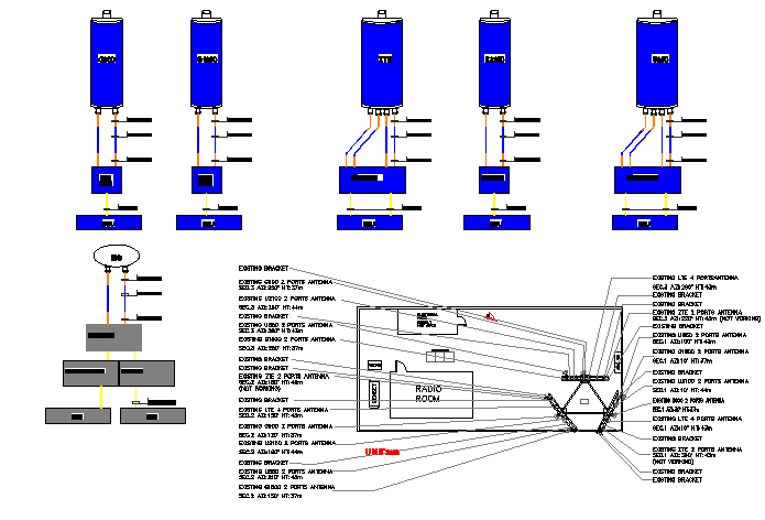 Three legged electric tower installation details with diagram that includes a detailed view of existing one and two ports panel antenna, leg one, leg two, leg three, incoming power, transformer, cable panel details, generator set, conduct, meter and much more of tower details.