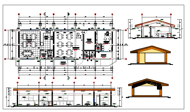 School module section and layout plan details that includes a detailed view of roof sectional view, cut sectional view, doors and windows view, main entry gate, entry lobby, staircase view, class rooms, head offices, staff room, girls and boys toilets, laboratory, library, computer lab, cultural hall and much more of school details.