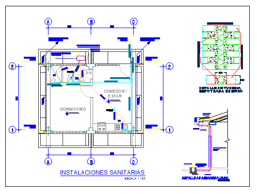 Sanitary installation details of house project that includes a detailed view of general structure details, family hall, lobby, toilets with doors and ventilation, toilet sheet installation, sink view, indoor toilets interior, water pipe line and much more of sanitary installation details.