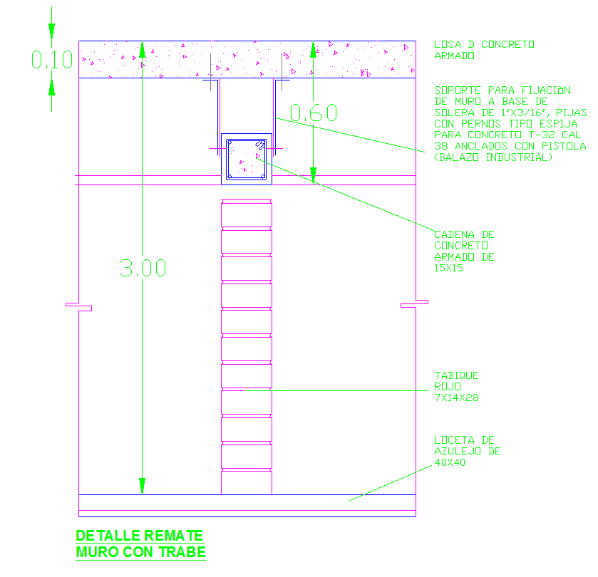 This CAD drawing file presents a highly detailed structural section showing the slab and column connection in reinforced concrete design. The drawing specifies construction elements like concrete beam chains (15x15 cm), red brick walls (7x14x28 cm), and tile flooring (40x40 cm). It also illustrates reinforcement anchors, wall supports, and fixing methods using steel bolts and plates for precision and safety in execution.