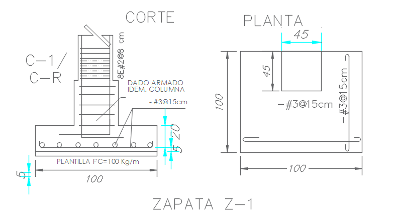 Footing plan and elevation detail dwg file, Footing plan and elevation detail with naming detail, dimension detail, reinforcement detail, bolt nut detail, etc.