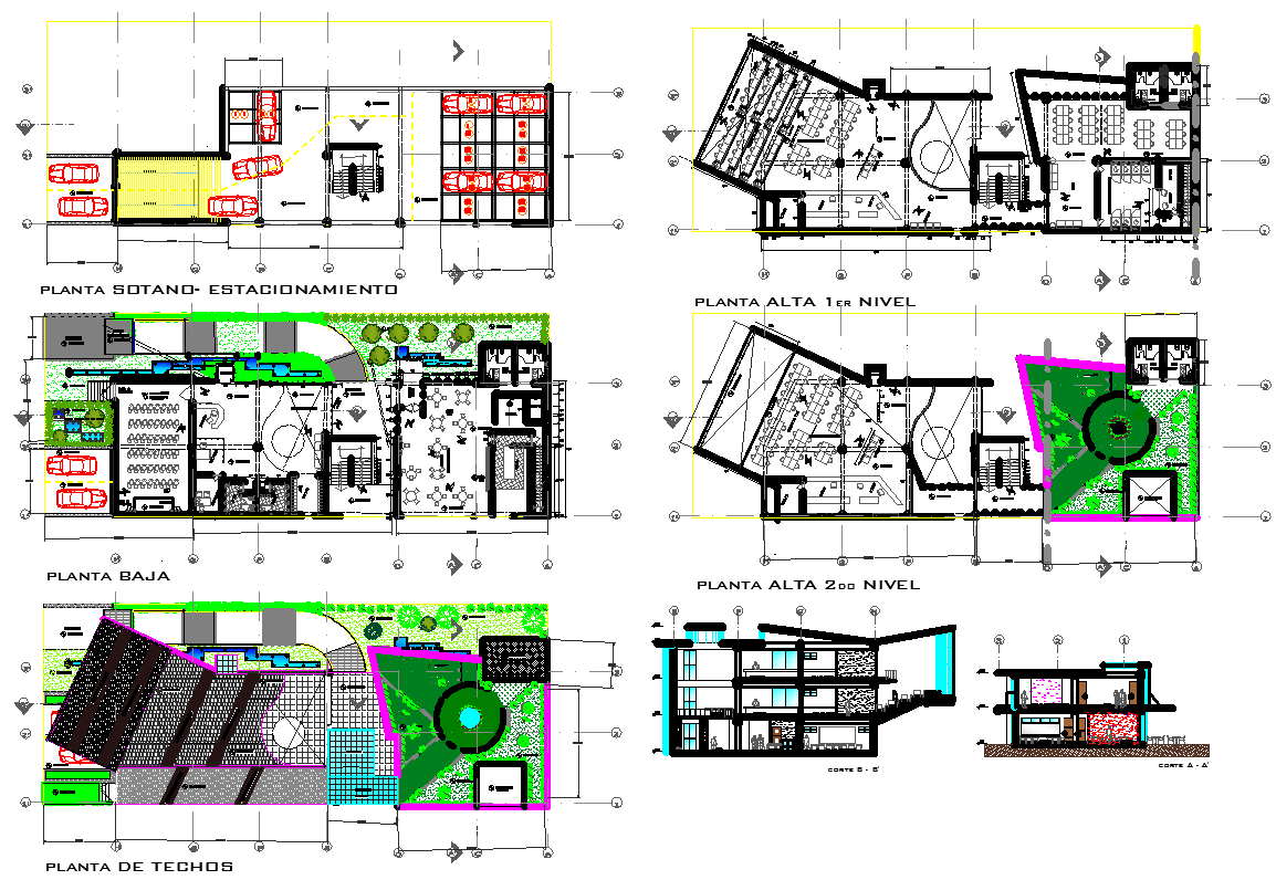 Multi-flooring management college architecture project that includes a detailed view of front elevation, back elevation, doors and windows view, front sectional view, back sectional view, sports ground, floor plan details with main entry gate, car parking area, main entry lobby, play ground, staff room, admin office, cultural hall, class rooms, head office, conference room, meeting room, library, laboratory, computer room, girls and boys toilet, staff toilets, kitchen, dining area, canteen and much more of college project.