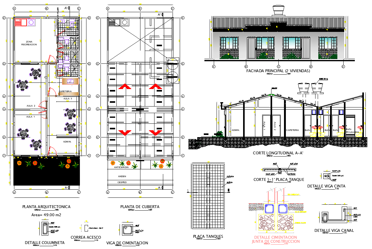 Kids garden architecture project that includes front elevation, back elevation, roof view, doors and windows view, structure view, classrooms, sanitary, library landscaping view, garden equipment and much more of garden details.