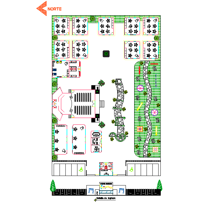Explore a detailed DWG file of a kindergarten and pre-school layout featuring classrooms, play areas, and activity zones. This CAD drawing file provides precise AutoCAD design layouts for educational institutions, allowing architects and designers to plan seating arrangements, furniture placement, and safe child-friendly spaces efficiently.