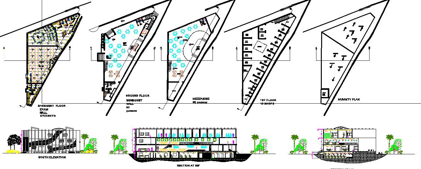 Educational institutional building elevation and plan dwg file, various layout and various elevation of those layout, furniture detail and arrangement