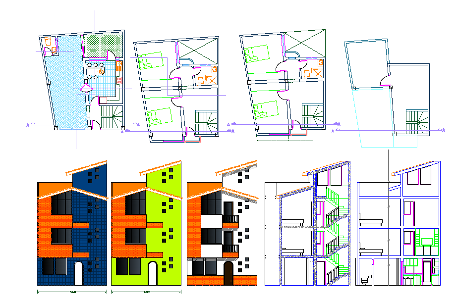 The elevation provides a vibrant architectural facade with distinct color segmentation in orange, blue, and green tones, enhancing the visual appeal of the residential structure. Additionally, the sectional view reveals the vertical arrangement of floors, wall thicknesses, and window placements ideal for construction and planning references. This DWG is suitable for architects, engineers, and design professionals involved in apartment or multi-unit housing projects.