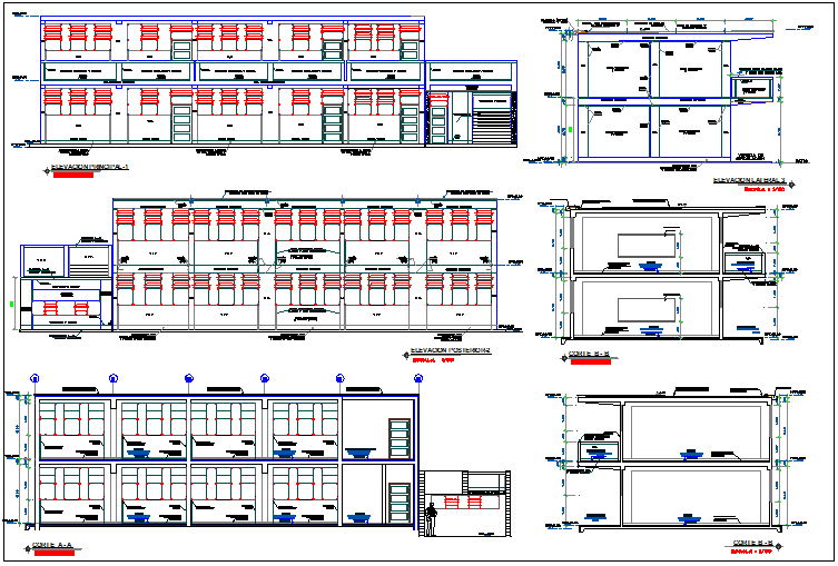 Architectural view with elevation and section view of school dwg file in elevation with view of wall and floor view with balcony,door,window and support view of school building with floor view and necessary dimension and section view.