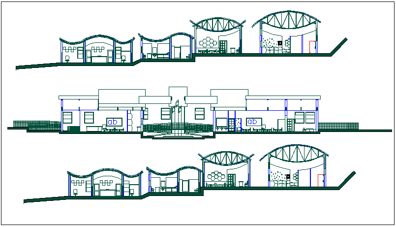 Elevation of pre school dwg file in elevation with floor view with wall and balcony view with support and door and window view.