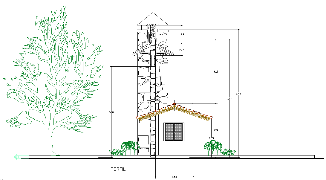 Small House AutoCAD File Front elevation detail with dimension detail, naming detail, both side tree detail.