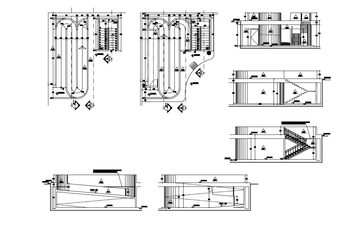 Staircase Design CAD File elevation and section detail dwg file, Stair plan, elevation detail and section detail with dimension detail, naming detail, center line plan detail.