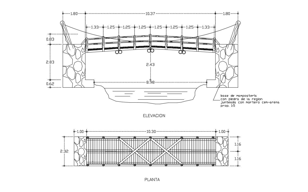 Bridge Design AutpCAD File and elevation detail dwg file, Plan and elevation detail with river reeling detail, dimension detail, naming detail.