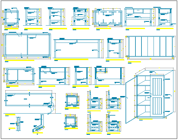 types of furniture like a table,cabin,table and desk table view with its section detail