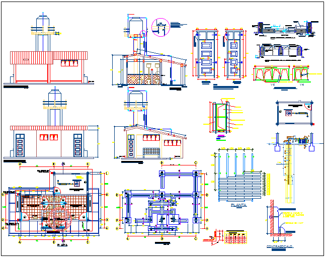 in plan with area distribution and wall view and view of classroom view with necessary dimension and elevation and section view.