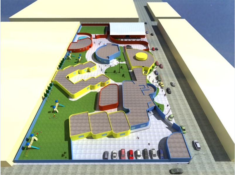 Top view of child day care elevation dwg file, garden area, play care upstairs , car parking