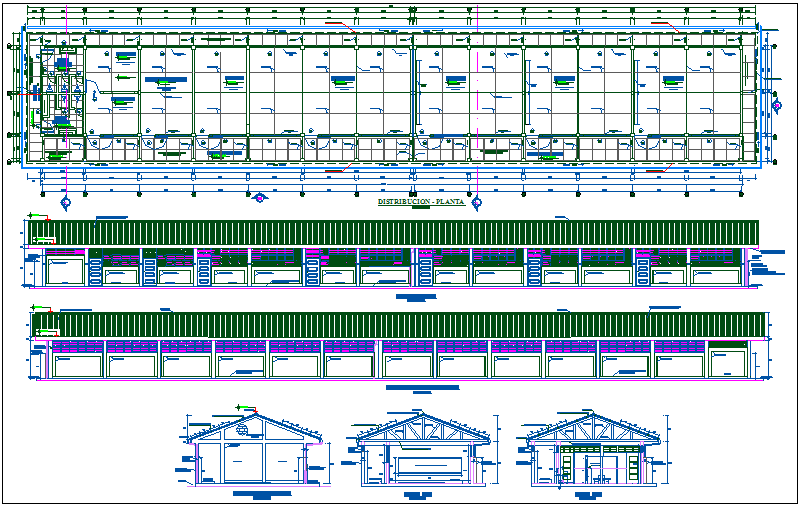 Distribution plan,elevation and section view with door and window detail of collage dwg file